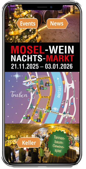With the Mosel Wine and Christmas Market app you get a detailed overview of the opening hours, events, parking and current news of the Christmas market in the Traben-Trarbach Underworld. Discover your location and find out how far it is to the next cellar. See which stand operator are waiting for you in the cellars. The app gives both visitors and locals an insight into what to expect at the Moselle Wine Christmas Market.