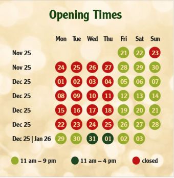 - 21 November 2025 to 21 December 2025: Friday to Sunday: 11 a.m. – 9 p.m.